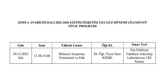 KİMYA ANABİLİM DALI 2025-2026 EĞİTİM ÖĞRETİM YILI GÜZ DÖNEMİ LİSANSÜSTÜ FİNAL PROGRAM 31/12/2025 DUYURULAR KİMYA ANABİLİM DALI 2025-2026 EĞİTİM ÖĞRETİM YILI GÜZ DÖNEMİ LİSANSÜSTÜ FİNAL PROGRAM KİMYA ANABİLİM DALI 2024-2025 EĞİTİM-ÖĞRETİM YILI GÜZ YARIYILI HAFTALIK DERS PROGRAMI